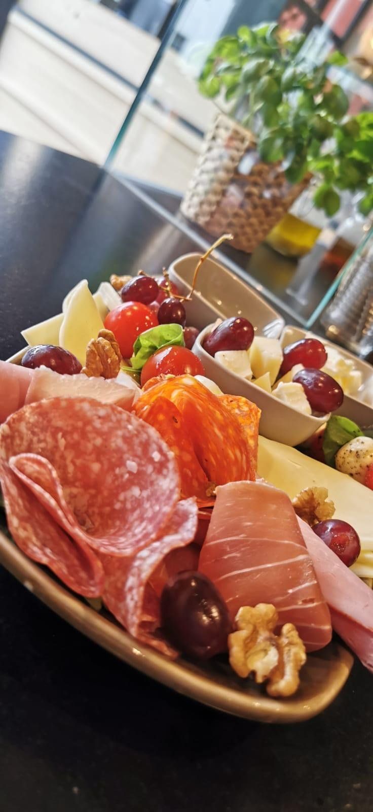 (grünes Pesto, Kirscht omaten, Mozzarellabällchen, Rucola und Parmesansplitter, Lauwarm serviert)